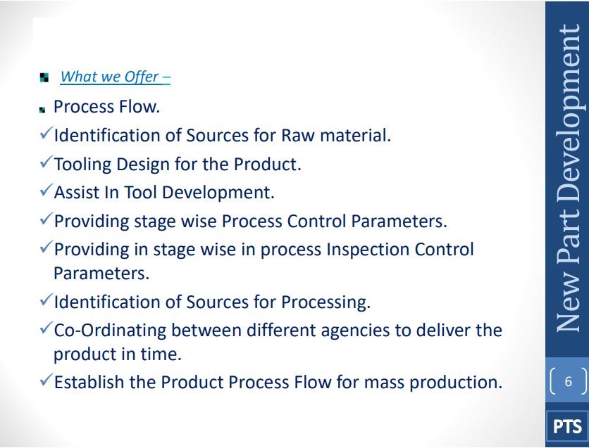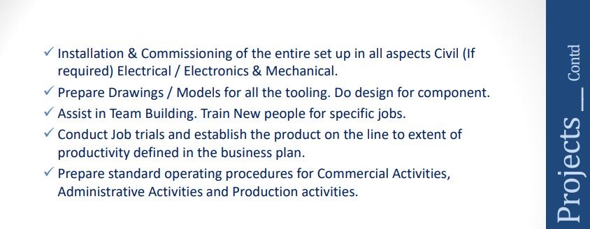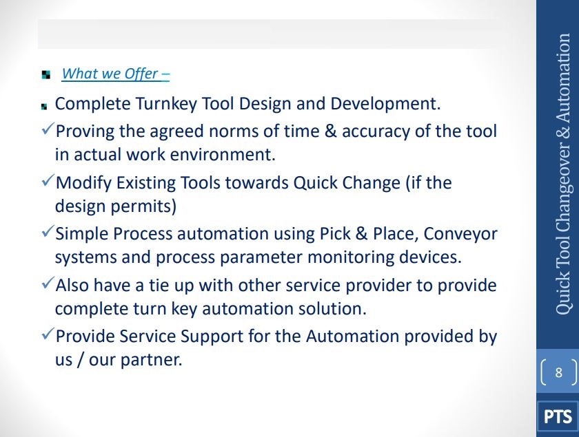 Key Areas of Operations Projects What we Offer – Pre Project ActivitiesWhat we Offer – In Pre Project ActivitiesWhat we Offer – Post Project ReportEquipment & Facilities New Part Development Quick Tool Change Over & Process AutomationHow we do thisAccomplishmentOther Success Stories as Individual Serving in Companies.